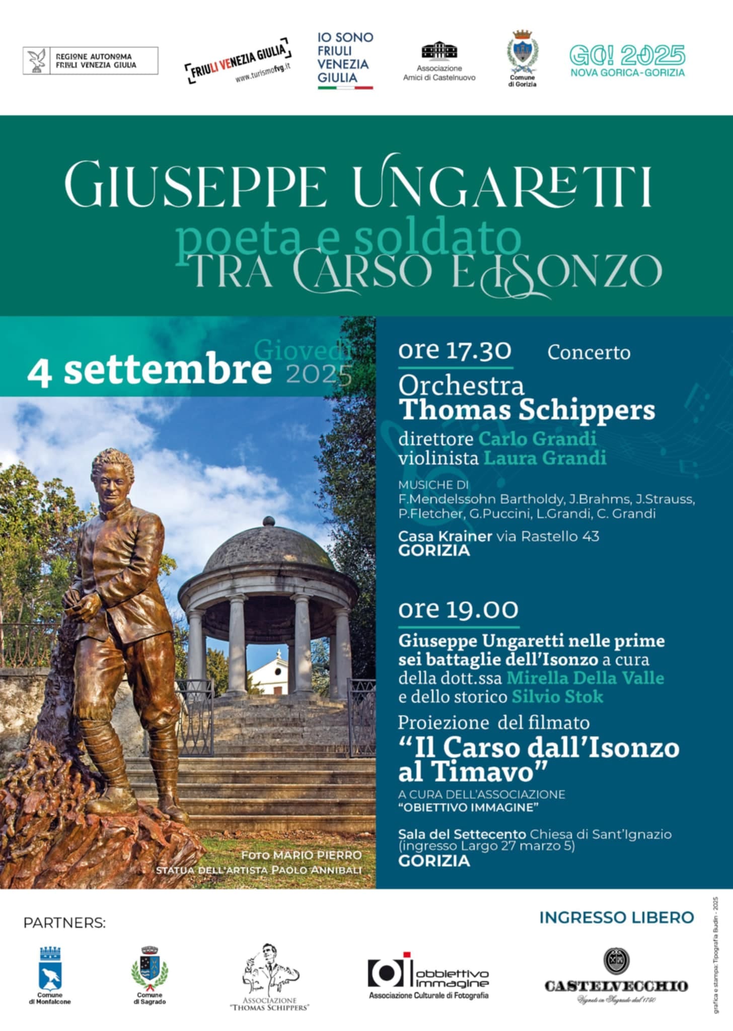 Alle 19, nella sala del Settecento della chiesa di Sant’Ignazio, si parlerà di “Giuseppe Ungaretti nelle prime sei battaglie dell’Isonzo”, con Mirella Della Valle e Silvio Stok. A seguire sarà proiettato il filmato “Il Carso dall’Isonzo al Timavo”, realizzato dall’associazione Obiettivo Immagine.
